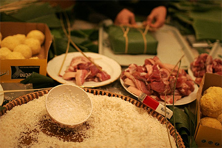Právě příprava slaného “rýžového koláče” bánh chưng připomíná výše zmiňovanou atmosféru při pečení cukroví. Během balení těchto koláčů jeden čistí listy, druhý je stříhá do vyžadovaného formátu, třetí balí. Často se takto scházejí členové rodiny, sousedé nebo přátelé a u přípravy koláče klábosí o všem možném i nemožném :)