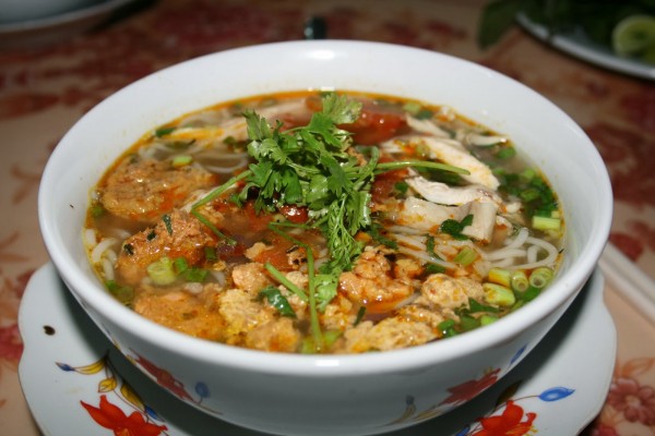 Fenomenální pokrm pojmenované podle císařského města Huế. Nudle bún se podávají v silném hovězím vývaru s typickou vůní citrónové trávy. Nedílnou součástí tohoto pokrmu je vepřové koleno nebo nožička a nesmí chybět ani talířek s nakrouhaným banánovým květem a bylinkami.