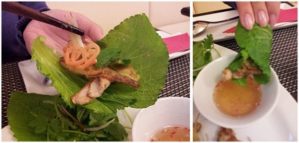 Jako další jsme si dali plněnou placku Bánh xèo, která mi ze zdejších předkrmů chutnala jednoznačně nejvíce. Křupavoučká placka z rýžové mouky a kokosového mléka obsahovala kousky vepřového masa, krevety a mungo klíčky. Bánh xèo se jí tak, že si odtrhnete kousek placky i s náplní, nandáte ho na list rau cải (pak čoi), přidáte bylinky a srolované namáčíte opět do sladkokyselé zálivky. K pravému bánh xèo by mezi bylinkami neměla chybět rybí máta a vietnamská bazalka. U Miss Saigon chyběly, ale chápu, že čeští strávníci ještě nejsou tak zvyklí na exotické bylinky, a proto nabídla jen známou thajskou bazalku a koriandr.
