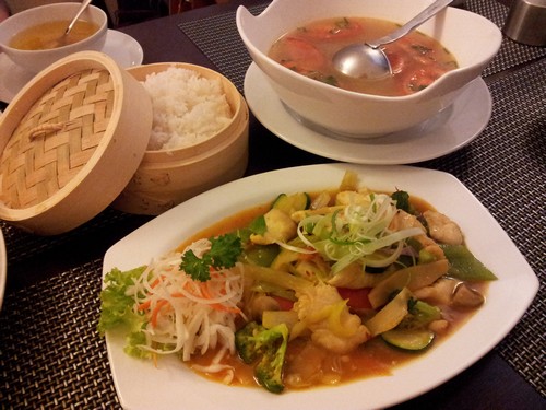 U druhého slaného pokrmu jsem očekávala, že dostanu gà sả ớt, jak ho znám z domova. Tedy kuře nasekané na menší kousky orestované s citronovou trávou. Dostaly jsme však s Mai Huong kuřecí nudličky z prsních řízků restované se směsí zeleniny. A po citronové trávě jsme musely tak trochu pátrat, mnoho jí tam nebylo. Tato verze gà sả ớt je zjevně přizpůsobena evropským chutím a já osobně preferuji spíše tu tradiční.
