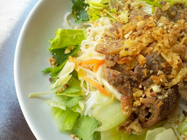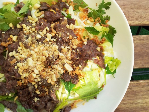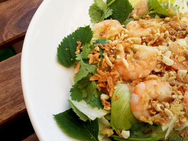 Při první návštěvě jsme si objednaly bún bò Nam Bộ a nộm tôm (krevetový salát). I když se nộm tôm nacházelo v sekci lehčích jídel, dostalo se stejné porce jako nún bò Nam Bộ. Jednalo se v podstatě o stejné pokrmy pouze s jiným masem.