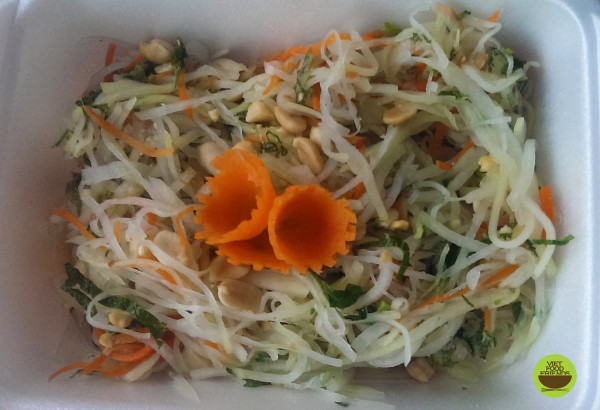 Další pokrm, který jsme ochutnaly, byl kedlubnový salát. Salát se skládal z kedlubny, kousky mrkve, opražených arašídů a nasekaných bylinek, na kterých se celkem šetřilo. Salát má mít tradičně sladko-kyselou chuť, což také splnil, ale bohužel nám přišlo, že s cukrem kuchař trochu „přestřelil.“ Dokážeme u vietnamských pokrmů snést větší sladkost více než ostatní, ale tento salát byl i na nás příliš sladký.