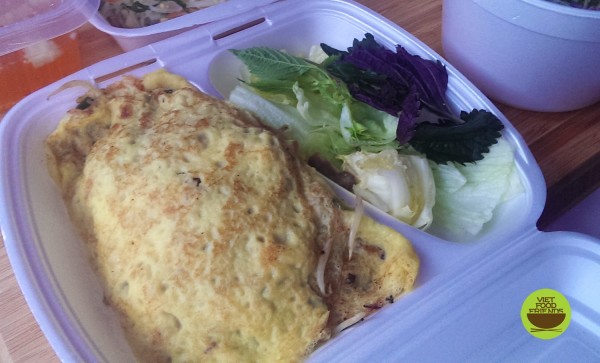 Nakonec jsme ochutnaly Bánh xèo, který jsme vám už představovali dříve. Placka samotná, která ztratila křupavost během převozu, nám ale i tak velice chutnala. Krásně voněla po kokosu a byla i chuťově vyvážená. Náplň placky obsahovaly restované krevety, kousky vepřového masa, mungo klíčky, žampiony, jarní cibulku a kuchyňskou cibuli. Oželily bychom nedostatek krevet, ale musíme se ohradit proti žampiónům, které se tradičně do náplně nepřidávají a které nám tam nesedly. Placka se podává se sladko-kyselo-pálivou zálivkou a zeleninou a bylinkami, které byly součástí pokrmu. Celkově nám ale placka Bánh xèo chutnala nejvíce, a pokud by se vynechaly žampióny, určitě bychom si ji objednaly znovu.