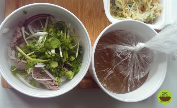 I v Thai An balili vývar a nudle odděleně ve dvou krabičkách, aby se nudle příliš nerozmočily. Vývar byl převezen ještě navíc v mikrotenovém sáčku, aby se zabránilo vylití. Vývar byl stále ještě horký a my se mohly pustit rovnou do ochutnávky. Vývar chutnal sladce, ale spíše díky koření a dochucovadlům. Silný nám obzvláště nepřipadal a v kombinaci s nudlemi nám přišel málo výrazný. Maso, které mělo být aspoň trochu růžové, už bylo bohužel spíše úplně provařené, ale jinak bylo dobře ochucené. Maso ještě doplnila jarní cibulka, kuchyňská cibule, trocha koriandru a mungo klíčky. Samotné nudle byly na náš vkus příliš měkké. Celkově nás Phở nikterak neoslnilo, ale ani neurazilo.