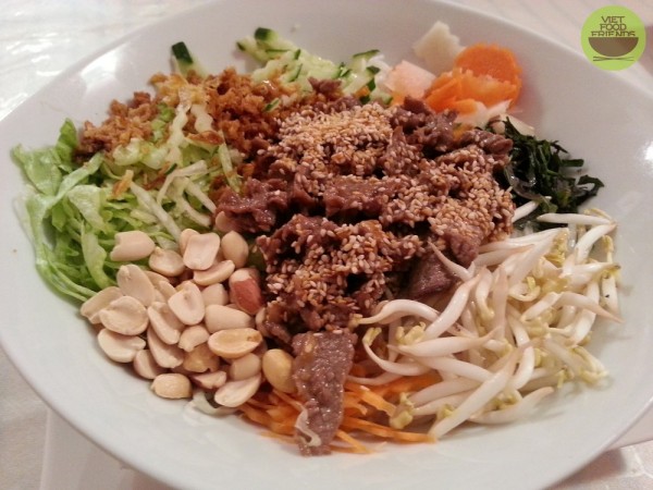bún bò Nam Bộ. Samostatné maso bylo tak akorát dochuceno, ale po promíchání s ostatními ingrediencemi se chuť trochu ztratila. Jinak bylo měkké a šťavnaté. Zálivka byla na můj vkus opět trochu přeslazená, ale nebylo to nic, co by se nedalo zvládnout. Jako mnohem větší mínus považuji to, že arašídy tu nedávají čerstvě upražené a lehce rozdrcené, aby byly aromatičtější, ale nasypou vám do mísy celé a předem upražené arašídy ze supermarketu. Čerstvě upražené a rozdrcené arašídy (viz recept na