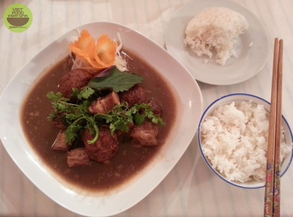 thịt kho tàu [thit cho tau], což je pomalu dušený vepřový bůček podlitý kokosovým mlékem, jeden z pokrmů tzv.